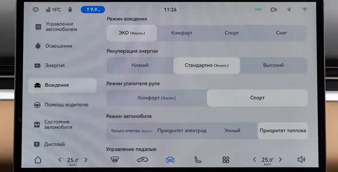 И то, что теперь для управления климатом или смены режимов движения необходимо обращаться к сенсорному экрану — скорее минус, чем плюс. К тому же, несмотря на достаточно логично выстроенное меню и похвальную скорость отклика, пользовательский интерфейс системы переведён на русский язык не совсем корректно. Например, в меню настроек ближнего света, позволяющем изменять расстояние пучка, термин «очень далеко» вовсе не означает наибольшую дальность освещения. В варианте «далеко» освещённая зона распространяется дальше.