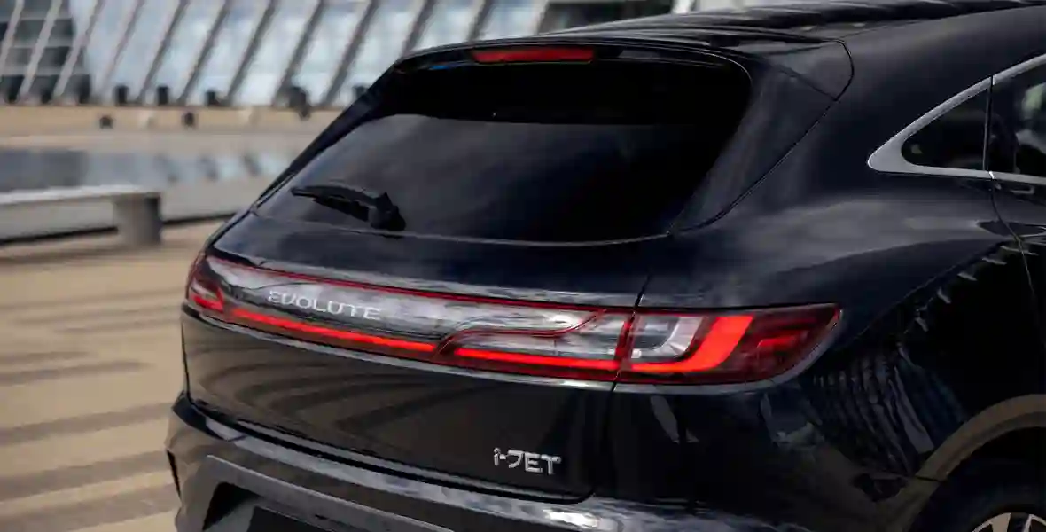 Формой кузова EVOLUTE i‑JET напоминает о Porsche Macan — особенно похожа задняя часть, где с немецким спортивным кроссовером его роднят не только светодиодные фонари во всю ширину, но и расположенная на креплении стеклоочистителя кнопка открывания двери багажника.